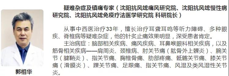 坐診專家:由馮曉明院長(第四軍醫(yī)大學(xué)教授、曾任職沈陽軍區(qū)第206醫(yī)院院長),郭相華院長(曾任職沈陽軍區(qū)240醫(yī)院門診部主任),張嘯院長(抗風(fēng)竤集團(tuán)醫(yī)療院長)等專家輪流坐診。